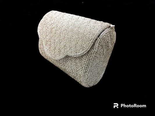 Women's White Pearls Hand Embroidered Party Box Clutch Purse Bag