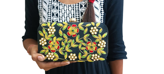 Zardosi work black velvet multicolor embroidery women and girls clutch bag