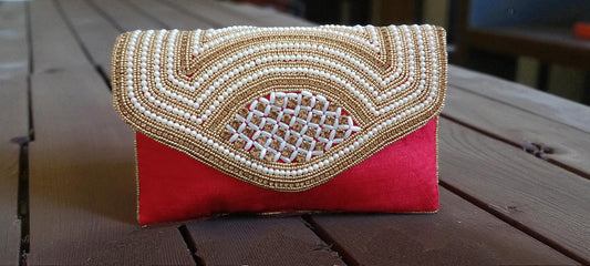 Ethnic gold color embroidery work women red clutch purse