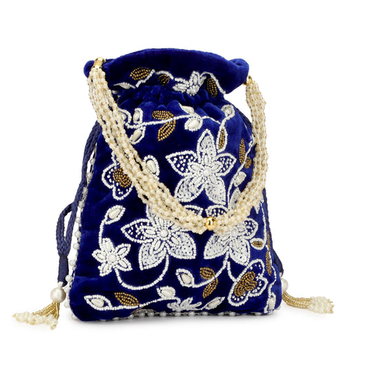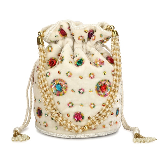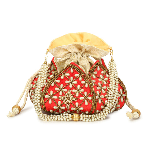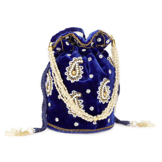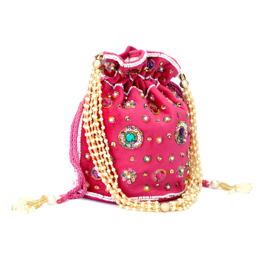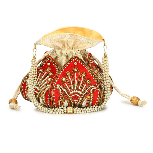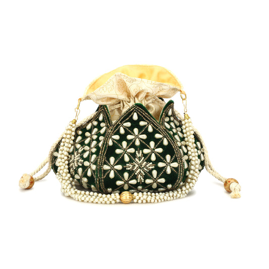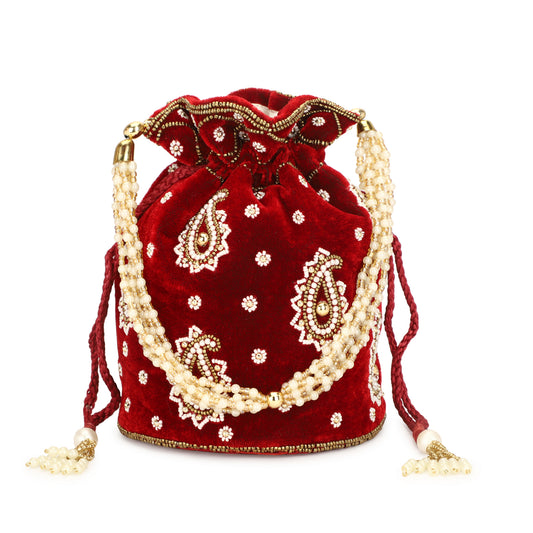 Handmade Stylish Velvet Potli Bag with Pearl and Bead Embellishments | Handcrafted Bridal | Party Clutch | Drawstring Pouch for Women and Girls