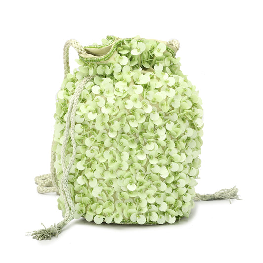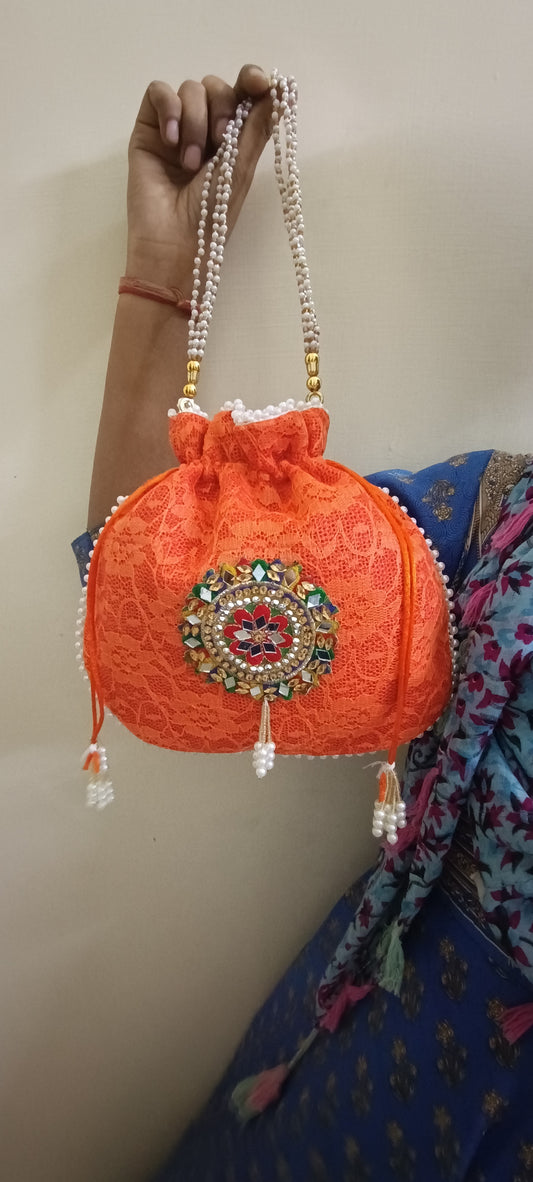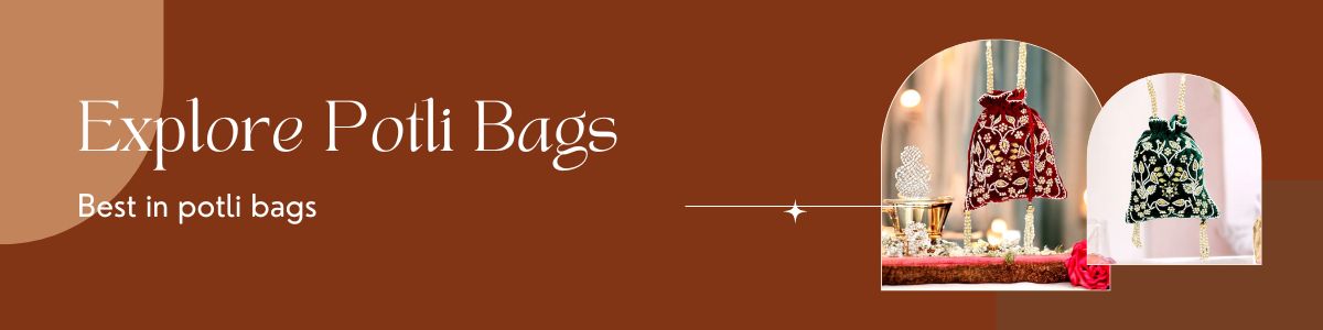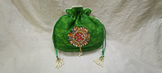 drawstring pouches that originate from India, known for their vibrant colors and intricate designs. Typically made from luxurious fabrics like silk, velvet, or brocade, these small bags are often embellished with ornate embroidery, beads, sequins, or mirror work.