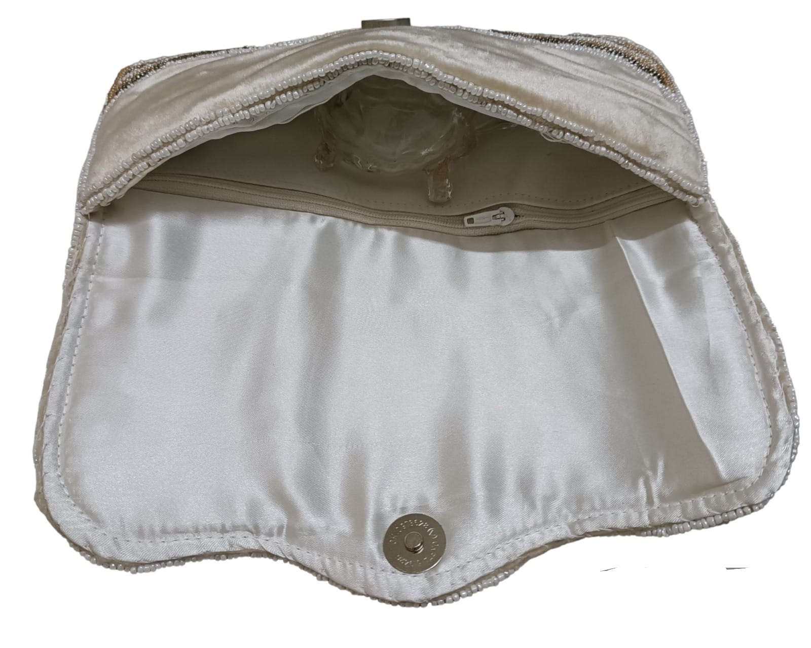 The clutch is made from high-quality fabric or synthetic materials and is carefully handcrafted with embellishments like beads, sequins, or embroidery.