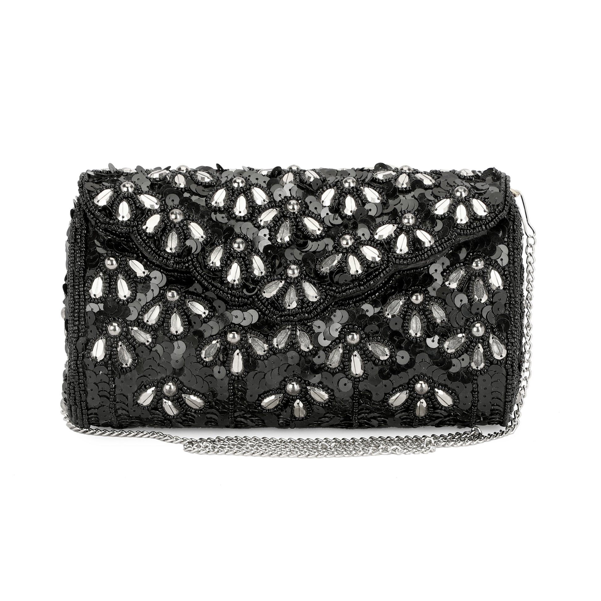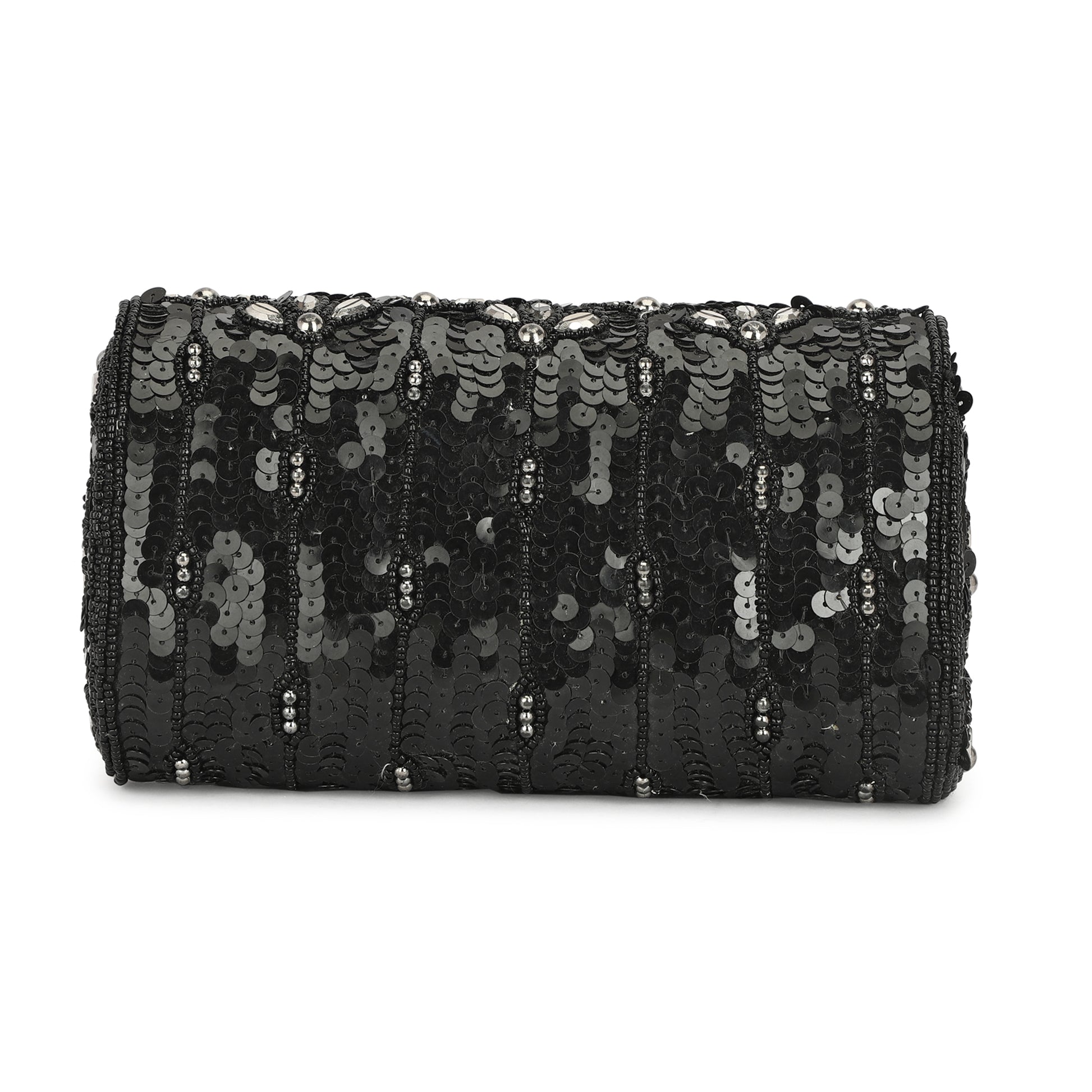This exquisite clutch bag is crafted from premium silk fabric, adorned with intricate zari embroidery and sparkling sequins. It features a pearl-studded handle and a spacious compartment, making it the perfect accessory for weddings, festive occasions, and parties."
